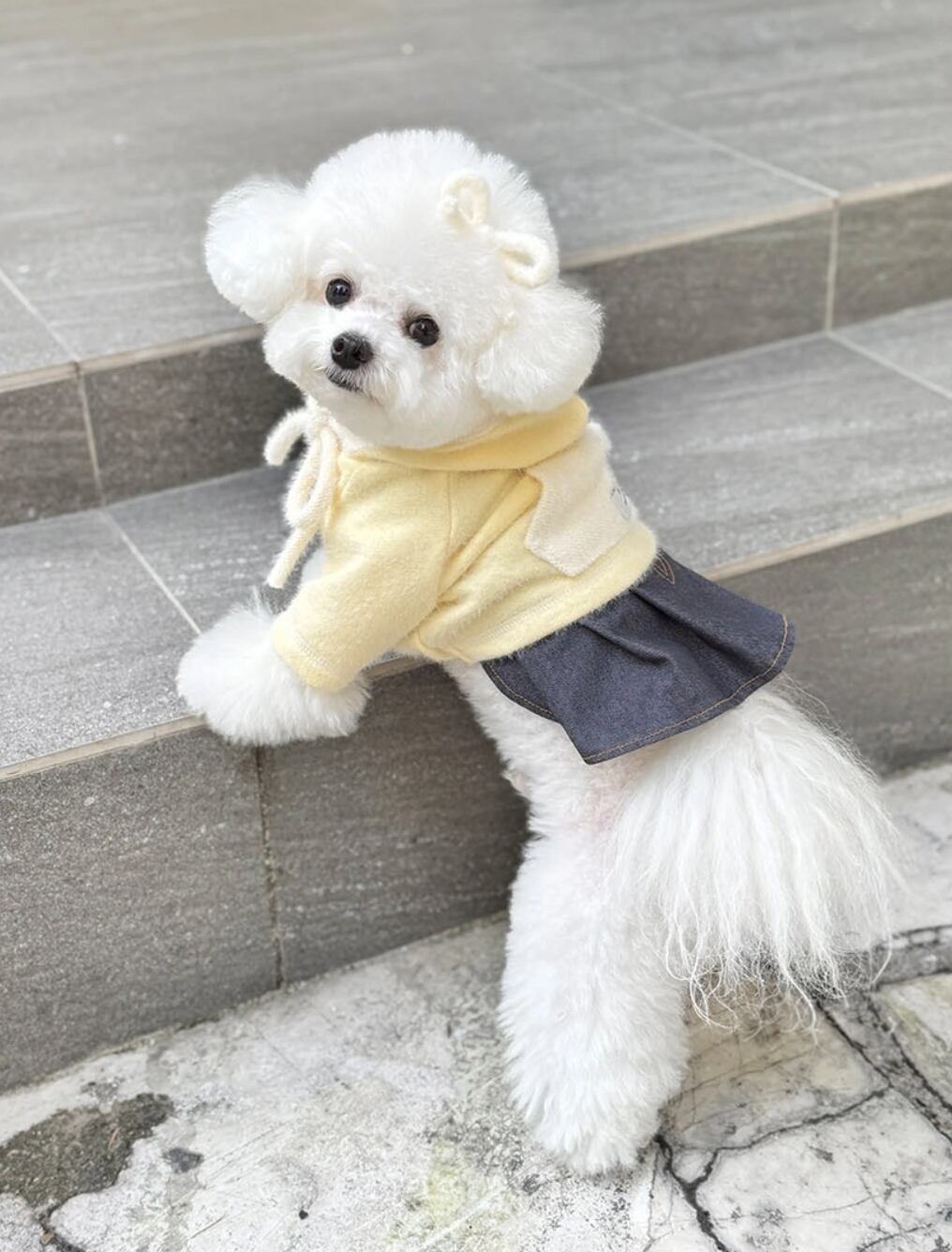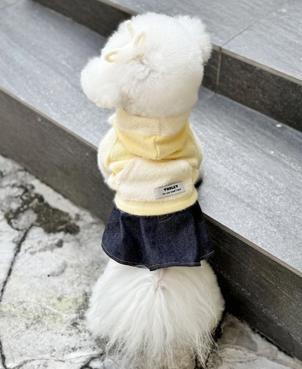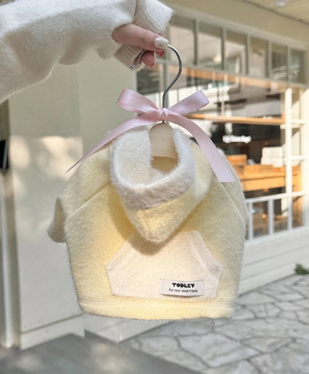 ふわふわの生地に可愛いフーディーのディテール。