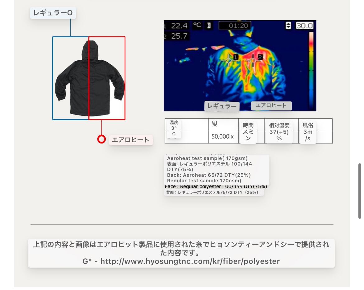 空気を含んで熱を保存し、光を吸収して自然に発熱するヒョソンティーアンドシーのエアロヒット生地を使用しました。