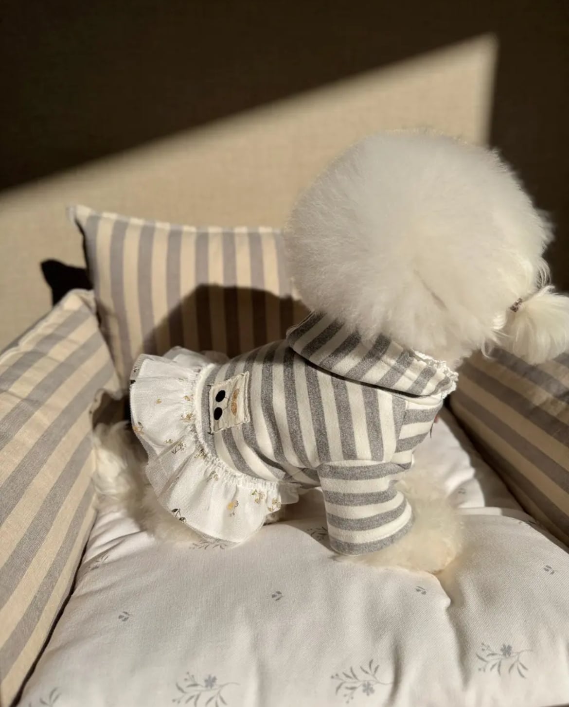ナチュラルなグレーのストライプ柄に、チェリーパッチポイントを追加した